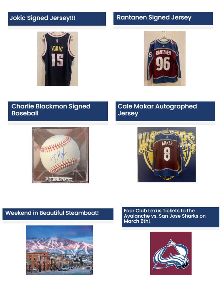 Consider bidding on items to help support our athletes! Many items are available including Cale Makar signed jersey and other signed sports memorabilia, Avalanche tickets, and more!