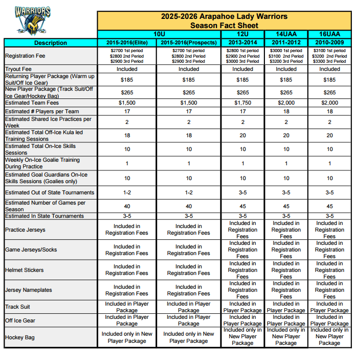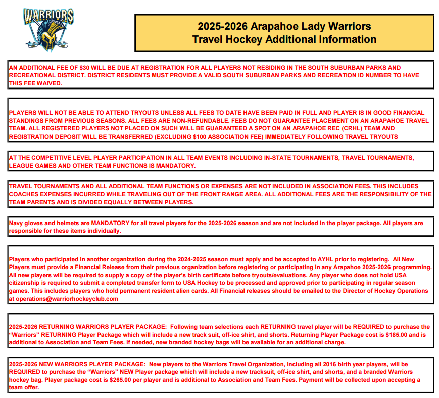 Welcome to the Arapahoe Lady Warriors Travel Hockey registration page for the 2025-2026 season. We are excited for the upcoming season and look forward to getting back on the ice!