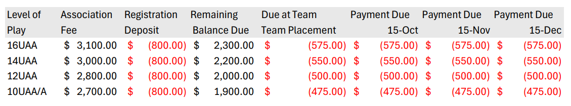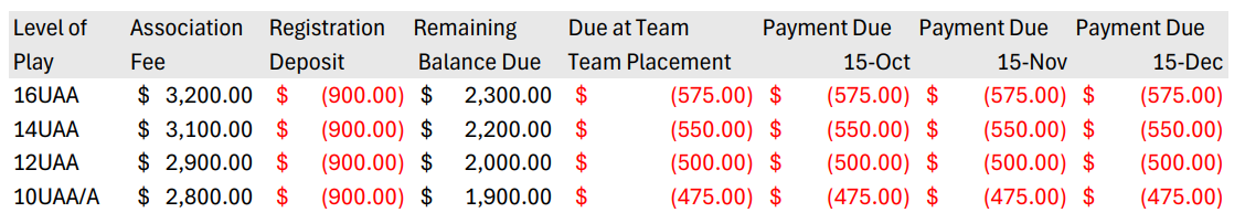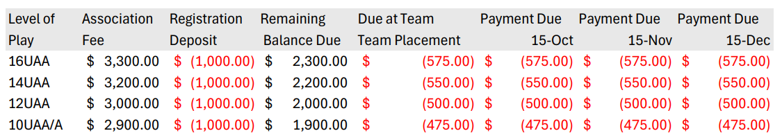 Please take the time to read the following information before registering your player for the 2025 - 2026 Season. To take advantage of the $100 Early Bird savings, sign up by July 31st.