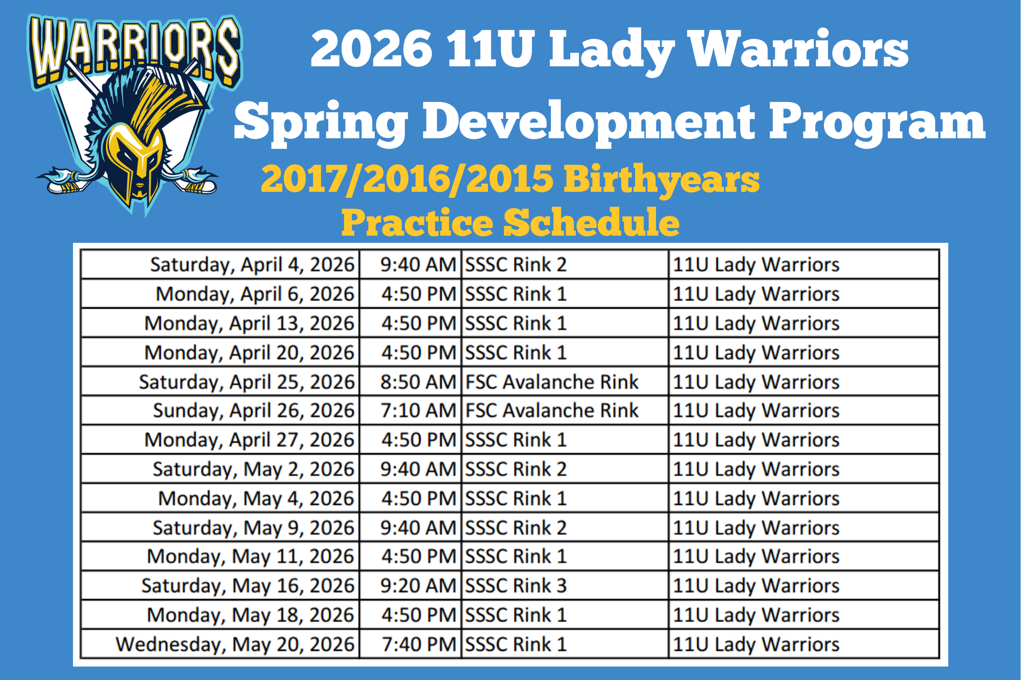 Lady Warriors Practice Schedule