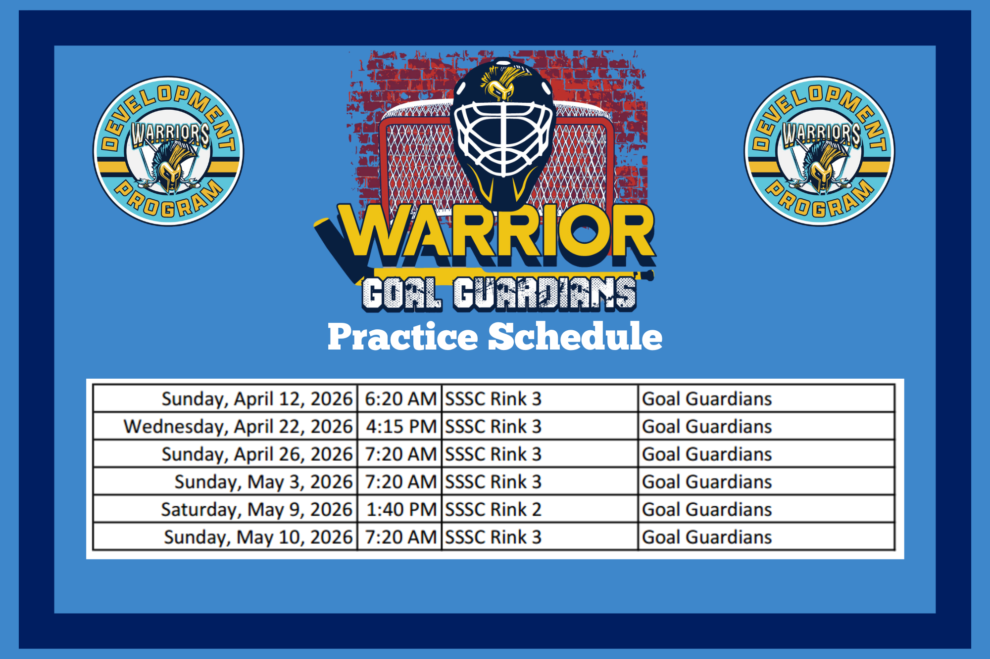 Warriors Travel Hockey is proud to announce the Spring Development Program Goal Guardians Coach Dillon Whalen and staff will be leading separate weekly sessions for all our Spring Program Goalies. We believe this is an excellent training opportunity for all Spring goalies to improve the fundamentals of their game. The focus will be on all aspects of the position, including save selection, positioning, and mental preparedness.