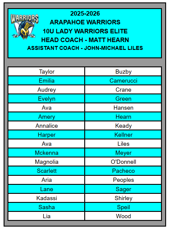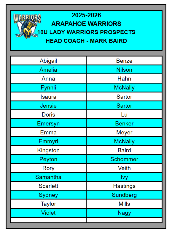 If your player is not listed below, he/she has been released from the Travel Program and will be refunded all amounts paid less the tryout and association fee. Contact Susan Pfeiffer at SusanP@ssprd.org to get a signup link for the Arapahoe Rec Program. 10u Rec evaluations will begin tomorrow 9/15.