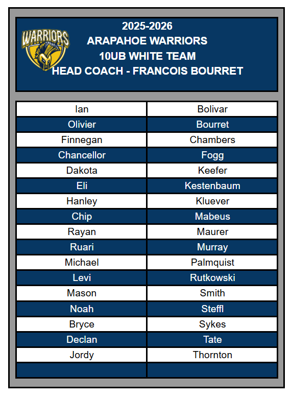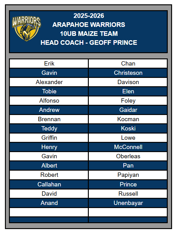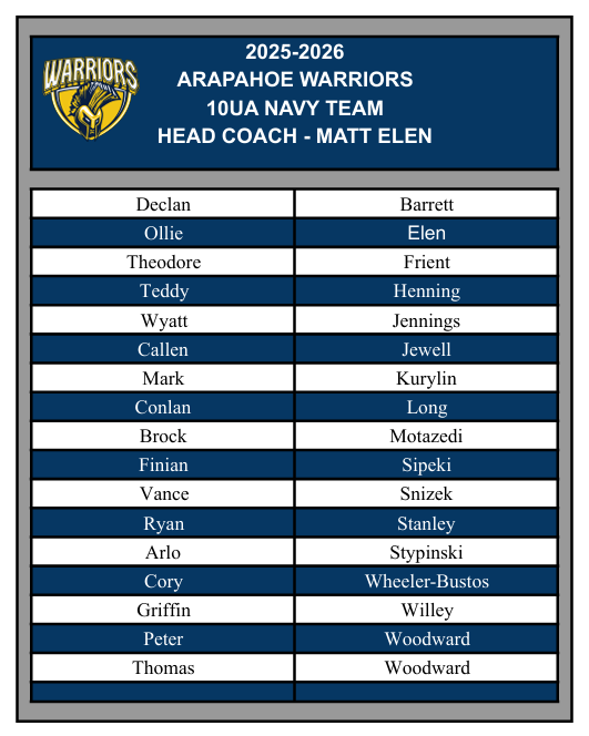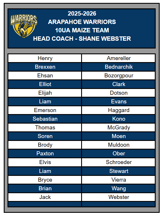 Congratulations to the following players selected for the Arapahoe 10UA Navy/Maize - 10UB Navy/Maize/White -10ULady Warriors Elite/Prospects teams. All players will receive a team offer via email. If you do not receive on 9/14, contact operations@warriorhockeyclub.com. Team Registration MUST be completed within 24 hours of receiving.