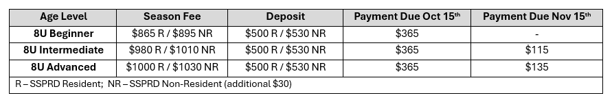 - All 8U players will be charged the 8U Beginner Level fee of $865 R/$895 NR at the time of registration. If your player makes an Intermediate/Advanced 8U team, an additional fee of $115/$135 will be charged to your account on November 15th.