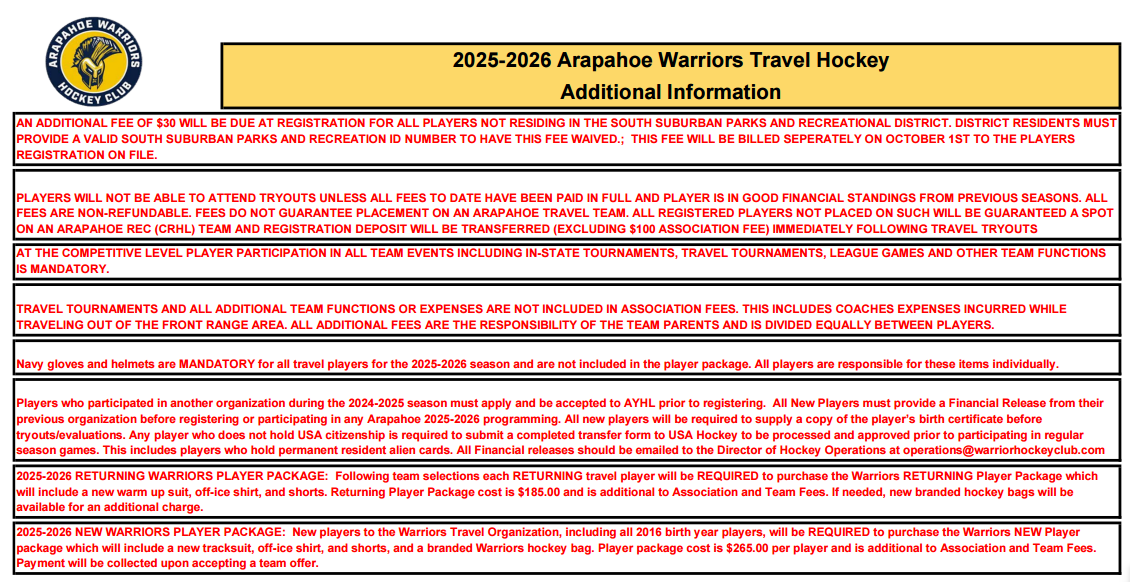 Welcome to the Arapahoe Warriors Travel Hockey registration page for the 2025-2026 season. We are excited for the upcoming season and look forward to getting back on the ice!